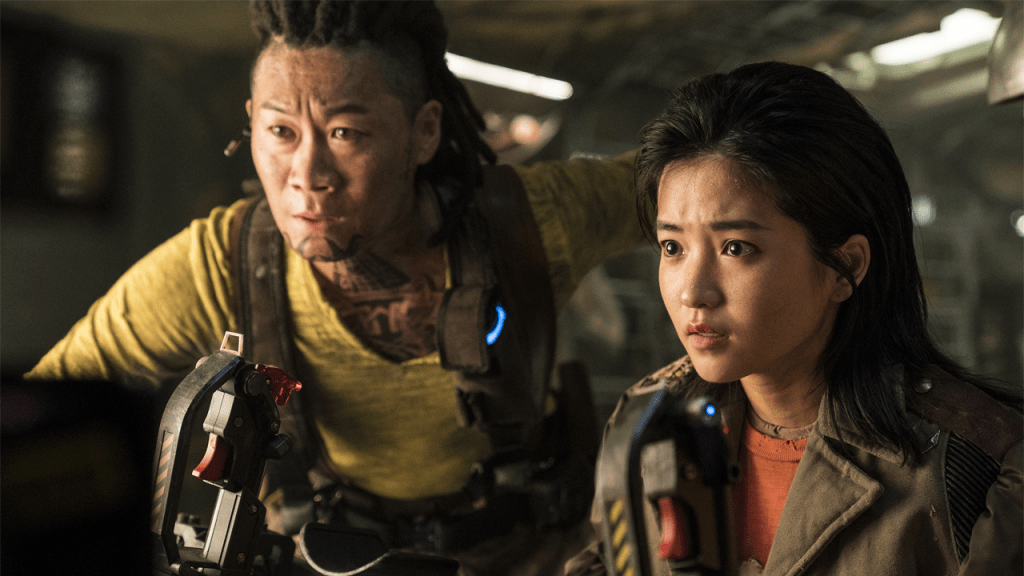 Space Sweepers blends together all of the best elements of space opera as it explores colossal space battles, awe-inspiring visuals, second-to-none technology, and a romanticised notion that a group of underdogs can defeat a towering, omnipotent evil overlord. While demonstrating a palpable passion for sci-fi, the film isn’t the most original or ground-breaking take on the genre as it rehashes a lot of set-ups, visuals, and character archetypes often found in sci-fi without expanding upon or re-energizing them. However, this doesn’t necessarily make Space Sweepers unenjoyable or not entertaining – but it certainly makes it a lot more predictable. To counteract this predictability, the film then stuffs itself full of twists, turns, and almost sub-plots to try and throw audiences off knowing what will happen next. Instances such as characters holding onto minuscule mouth-bombs for years (the narrative has an affinity for bomb plots), the half-explained reason why violent red veins often break out onto Sullivan’s skin, and the mysterious ‘super plant’ UTS hold are never fully explained or amount to anything – making the film feel a bit convoluted and underexplained at times.