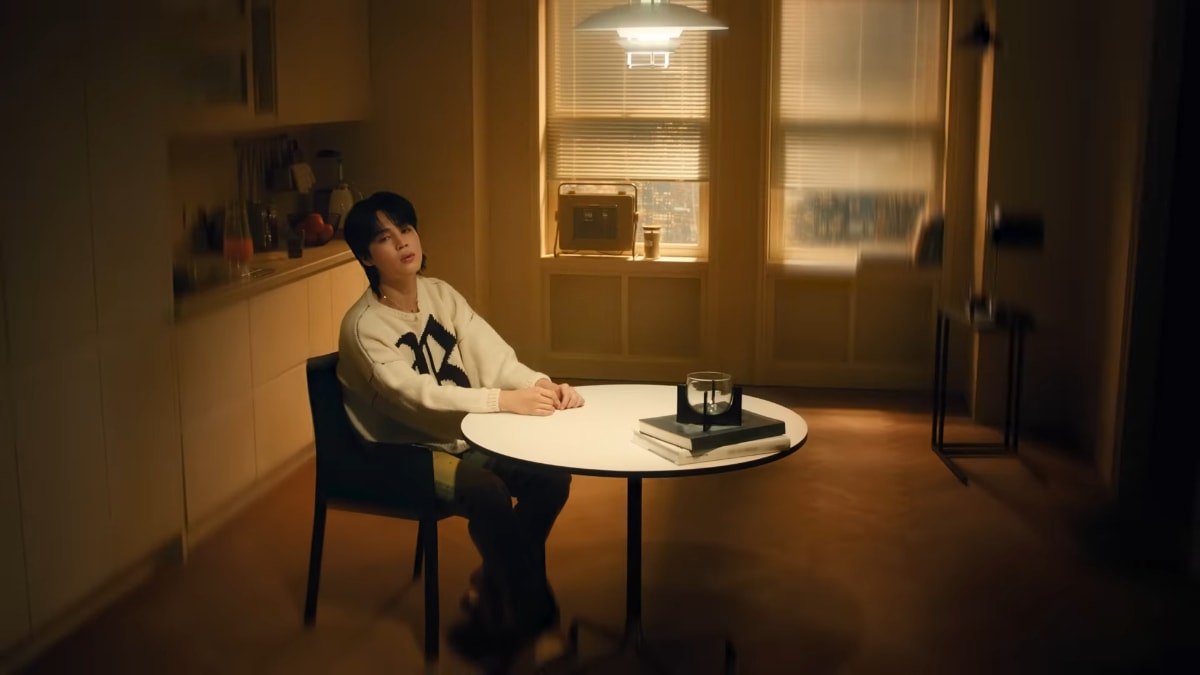 The colour scheme shifts for the first verse; an extreme canted close-up of Jimin’s eye provides a mechanism of transitioning from interiority to exteriority: the green filter is removed as the camera pulls back, and Jimin is revealed sitting at a table in a room on his own as yellow light flickers bathing the artist in the artificial sun. However, the flickering light also reveals a dark floor, the earthy tone and texture incongruous with the setting. The lyrics stress the importance of embracing the moment, and not worrying about tomorrow as Jimin recounts the woman asking him to “stay with her until today”.
