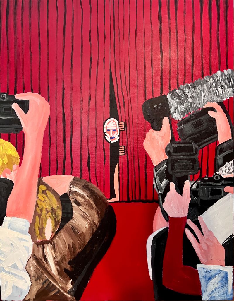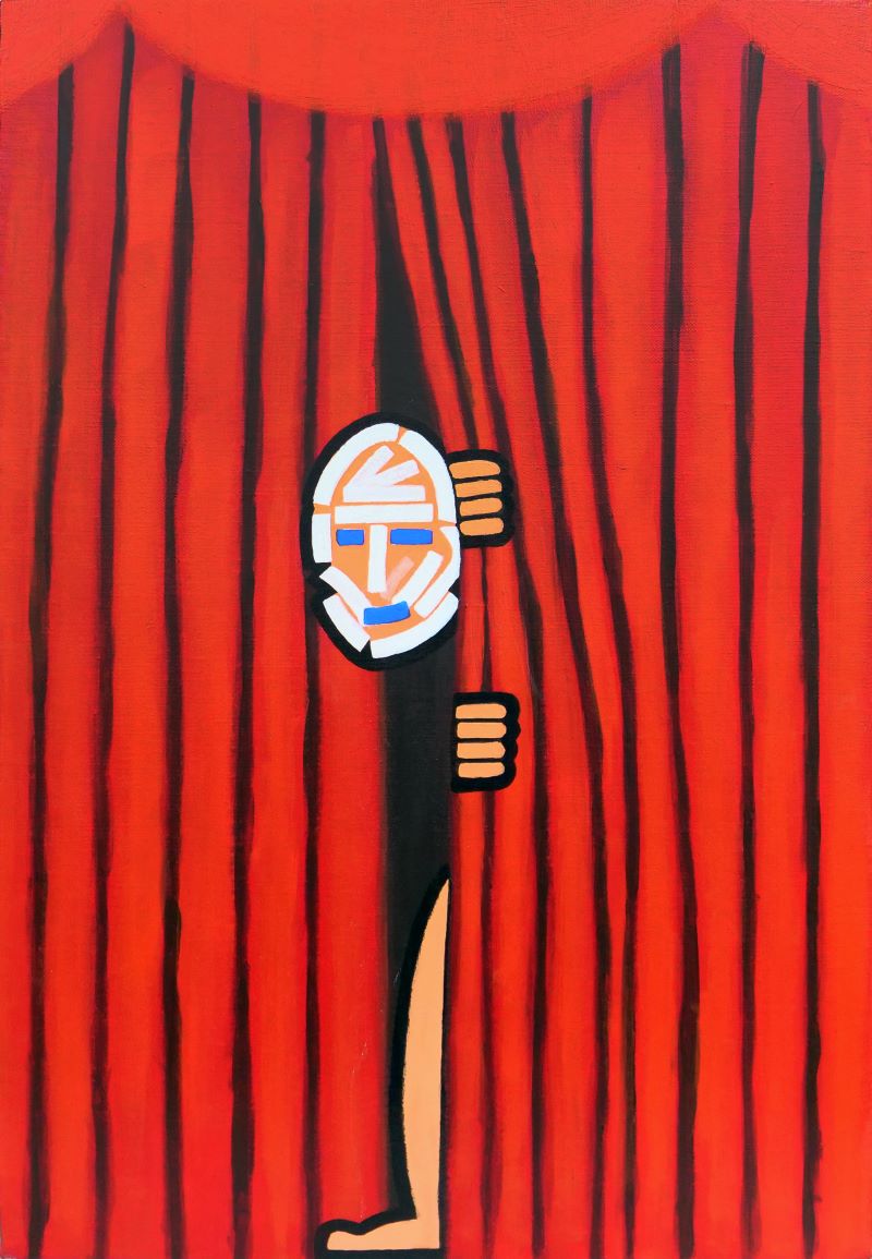 The duality of Smile Boy, simultaneously excited and fearful of attention, mirrors Kang Hui’s exploration of life’s dualities: light and darkness, happiness and grief. The red curtain, a recurring concept, symbolises the division between these conflicting emotions. And while chatting with Kang Hui, he elaborated on the subject: “What I try to express in my work, and what I am still struggling with, is how to [create it] in a more direct way. We have moments of happiness in our lives, but also moments of sadness, and without a doubt, both of these feelings co-exist together. I have featured the character of Smile Boy and the red curtain to show the division between the two”.